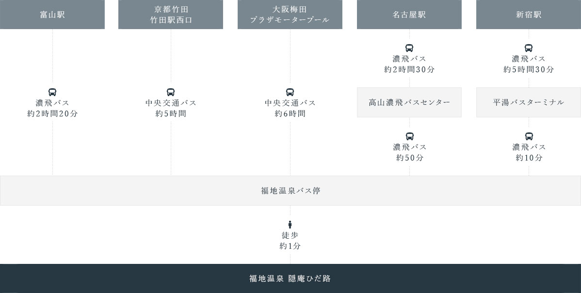 | 送迎先 | 濃飛バス新穂高線バス停【福地温泉口】HO45までにかぎり送迎を行っております。ご利用の際は事前にお伝えくださいませ。 |